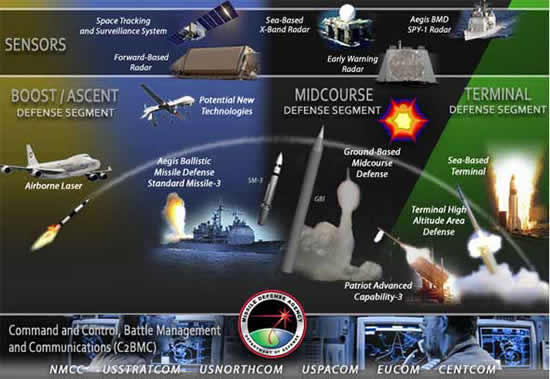 美國(guó)彈道導(dǎo)彈防御系統(tǒng)包含衛(wèi)星定位偵察系統(tǒng)、前沿部署雷達(dá)、X波海基雷達(dá)、早期預(yù)警雷達(dá)、宙斯盾雷達(dá)系統(tǒng)的預(yù)警探測(cè)系統(tǒng)、空基激光反導(dǎo)武器、宙斯盾平臺(tái)搭載的“標(biāo)準(zhǔn)-3”導(dǎo)彈、無(wú)人機(jī)等新型武器、陸基中段彈道導(dǎo)彈防御系統(tǒng)、;K端防御武器、“愛(ài)國(guó)者-3”導(dǎo)彈、終端高空區(qū)域防御導(dǎo)彈系統(tǒng)等武器系統(tǒng)和指揮、控制、戰(zhàn)場(chǎng)管理和通訊系統(tǒng)。
