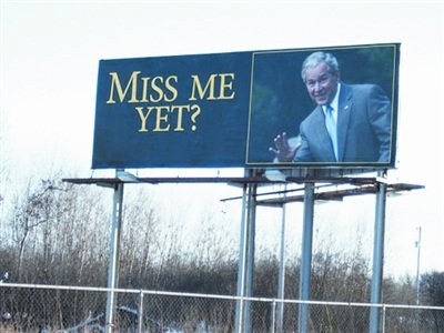 在廣告牌上,右側(cè)是一張小布什的照片,左側(cè)是一句設(shè)計臺詞:“想我了嗎?”