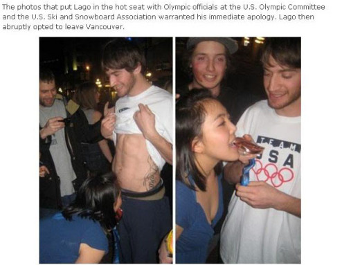 日前,一些關(guān)于拉戈在比賽后慶祝勝利盡情放松的照片在互聯(lián)網(wǎng)上流傳。從照片上看,拉戈與朋友們的慶祝方式極為不雅,他因此被斥為美國隊的恥辱。照片中,拉戈在溫哥華市內(nèi)的一處房屋內(nèi),身著美國隊訓練服,佩戴著剛剛獲得的銅牌,而一名不知名的女子在他的腰部左右的位置親吻拉戈的獎牌。