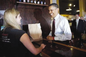 當(dāng)天,奧巴馬原定在水牛城發(fā)表一份有關(guān)國內(nèi)經(jīng)濟(jì)形勢的演講。午飯時間,總統(tǒng)車隊(duì)臨時停在一家小吃店。