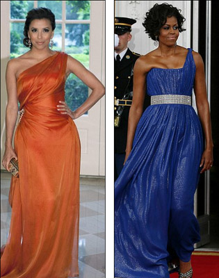 中新網(wǎng)5月20日電 據(jù)外媒報道,美國白宮19日舉辦國宴,款待墨西哥總統(tǒng)卡爾德龍夫婦。此間美國第一夫人的穿衣打扮再被媒體拿出來品頭論足。不幸的是,這次米歇爾•奧巴馬竟然與“絕望主婦”伊娃•朗格利亞大撞衫,頗為尷尬!