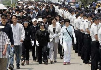 中新網(wǎng)5月26日電 韓國慶尚南道金海市峰下村25日的白天最高氣溫達(dá)到了30度,當(dāng)天是韓國前總統(tǒng)盧武鉉逝世的第三天。從村子入口通往盧武鉉靈堂的兩公里長雙向2車道公路上,沒有一點(diǎn)兒背陰處。由于警方在村口阻止車輛進(jìn)入,市民們只能頭頂報紙、手帕、草帽,在往返需要一小時的炎熱的柏油路上步行前往焚香所。很多人即使汗如雨下也沒有脫掉黑色的西服上衣。