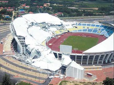 意外發(fā)生于當?shù)貢r間2日上午9時30分左右發(fā)生,涉及坍塌的部分包括體育館的頂蓋前方及左右兩方,坍塌范圍約占全頂蓋建筑結(jié)構(gòu)的60%,F(xiàn)場所見,整個全長134米橢圓形頂蓋,其中80米陷入墜毀的情況。