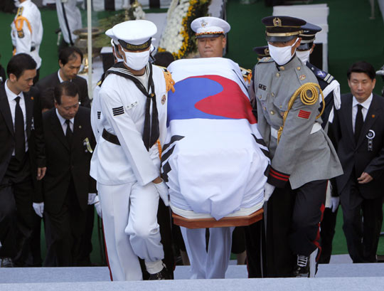 金大中遺屬李姬鎬女士等、韓國(guó)總統(tǒng)李明博和第一夫人金潤(rùn)玉、前總統(tǒng)金泳三、憲法機(jī)關(guān)負(fù)責(zé)人、駐韓外交使節(jié)、各國(guó)代表及市民等歷史最大規(guī)模的3萬多人參加了當(dāng)天在國(guó)會(huì)前院舉行的遺體告別儀式。儀式持續(xù)約90分鐘。
