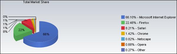 NetApplications上公布的統(tǒng)計數(shù)據(jù)顯示,今年4月IE的份額為66.1%,火狐為22.48%,蘋果Safari為8.21%,Chrome為1.42%。數(shù)年前,微軟IE市場份額曾高達90%以上,但近年來隨著火狐、蘋果Safari及谷歌Chrome等瀏覽器的崛起,微軟IE市場份額一直呈下降趨勢。