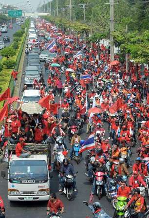 第一波示威活動于12日傍晚結(jié)束。紅衫軍13日將重新集結(jié),前往皇家田廣場等主要集會場所,附近是熱門旅游景點(diǎn)大皇宮及玉佛寺。東北部和北部各省的上萬紅衫軍支持者昨天也開始向曼谷出發(fā),將于周日抵達(dá)。