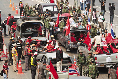 泰國政府原規(guī)定不準(zhǔn)外府紅衫軍駕車入城,以免造成交通堵塞,但紅衫軍拒絕了政府軍警安保人員的要求,軍警為避免和示威者發(fā)生對(duì)抗,最后讓紅衫軍一路開車長驅(qū)直入曼谷市區(qū)。