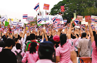 這批“粉衫軍”包括來自曼谷朱拉隆功大學(xué)的師生、旅游業(yè)者和“和平網(wǎng)絡(luò)”組織的成員,有人稱他們?yōu)椤胺奂t運(yùn)動(dòng)”。在前副警察總長(zhǎng)瓦西和朱拉隆功大學(xué)政治科學(xué)系主任乍叻帶領(lǐng)下,他們昨日在倫披尼公園內(nèi)的拉瑪四世像前宣誓,矢言保護(hù)國(guó)家,同時(shí)聯(lián)署請(qǐng)?jiān)感牛磳?duì)解散國(guó)會(huì)和修改憲法,指此舉不符合國(guó)家最佳利益。