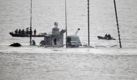海軍方面的一位有關(guān)負(fù)責(zé)人表示:“風(fēng)浪很大,再加上出現(xiàn)‘漲潮’現(xiàn)象,水流速度非常快,因此周末之前很難完成打撈作業(yè)!必(fù)責(zé)打撈作業(yè)的民間企業(yè)的一位有關(guān)負(fù)責(zé)人表示:“如果現(xiàn)在繼續(xù)進(jìn)行打撈作業(yè),鐵鏈可能會破入船體的脆弱部分。能承受鐵鏈力量的船體耐用材料已經(jīng)流失!