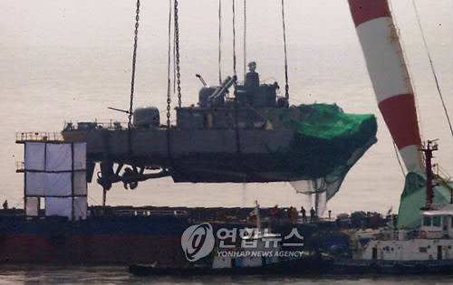 中新網(wǎng)4月15日電 據(jù)韓聯(lián)社報(bào)道,韓國“天安”艦艦尾的打撈工作15日進(jìn)行。由韓國軍方和民間組成的打撈工作組,15日下午1時(shí)14分利用大型起重機(jī),將“天安”艦船尾打撈出水后,成功放置在駁船上。