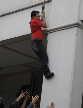 紅衫軍領(lǐng)導(dǎo)人阿里斯曼(Arisman Pongruanrong)通過繩梯從位于曼谷市中心的這家酒店爬下,在等候的紅衫軍民眾的幫助下,進(jìn)入一輛車中然后迅速離開。另外一名紅衫軍領(lǐng)導(dǎo)人從酒店窗戶爬出并順著一棵樹滑下,也成功逃離現(xiàn)場。