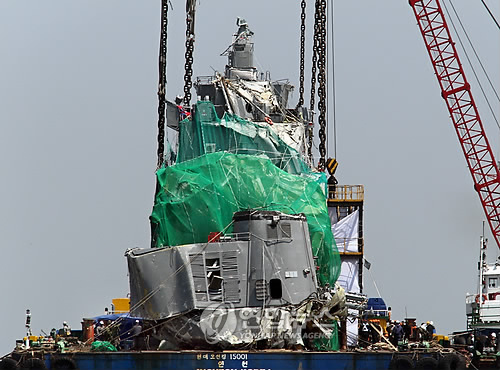 被吊至駁船上,在進(jìn)行固定之后,韓國(guó)海難救援隊(duì)(SSU)將進(jìn)入艦艇內(nèi),進(jìn)行遺體找尋工作。與此同時(shí),軍民聯(lián)合組成的調(diào)查團(tuán)將開展事故原因的調(diào)查工作。