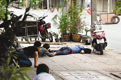 軍隊(duì)包圍“紅色戰(zhàn)區(qū)”,四周不時(shí)傳出槍聲和爆炸聲,軍方加強(qiáng)搜查武器和繼續(xù)“有出無(wú)入”的策略。政府發(fā)言人說(shuō),前晚主陣地的示威人數(shù)減至6000,證明封鎖策略有效,相信老人和小童已撤走。