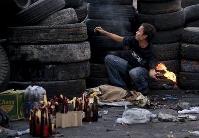有“紅衫軍”成員將一輛油罐車駛至一個主要路口,并燃燒輪胎企圖引爆。目擊者說,除了商場和酒店林立的商業(yè)區(qū)外,市內(nèi)另一處地區(qū)也發(fā)生流血事件。有三幢商業(yè)大廈著火焚燒。當(dāng)局周一開始局部封鎖市內(nèi)著名游客區(qū)蘇坤蔚路。
