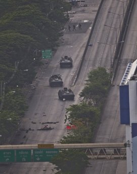 軍方擴(kuò)大了對紅衫軍聚集區(qū)的封鎖范圍,并使用擴(kuò)音器呼吁在這一區(qū)域內(nèi)的所有人返家。昨晚有傳聞軍方將展開清場行動,今晨仍能聽到零星槍聲。