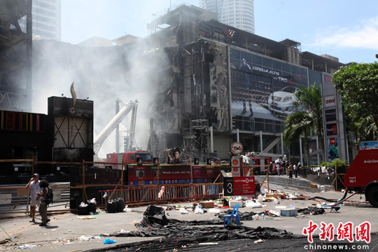 離此咫尺之遙的便是曾被曼谷人引以為豪、號(hào)稱亞洲第二大的森特沃購物中心,19日下午被人放火燃燒。記者在現(xiàn)場看到,該樓的部分建筑已經(jīng)垮塌,三支高壓水龍正對(duì)著垮塌處噴水。據(jù)稱,當(dāng)天搜救人員從廢墟中發(fā)現(xiàn)一年齡大約35歲男子的尸體。官方初步估計(jì),曼谷19日晚至20日晨火災(zāi)造成的損失或達(dá)數(shù)十億美元。
