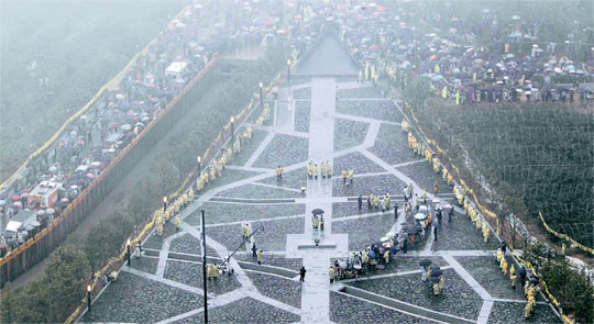 當(dāng)天下午1點(diǎn)30分在墓前面的空地,追悼?jī)x式開始了,F(xiàn)場(chǎng)上映了追悼前總統(tǒng)盧武鉉的短片,追悼?jī)x式現(xiàn)場(chǎng)人潮一度達(dá)到3萬多名。