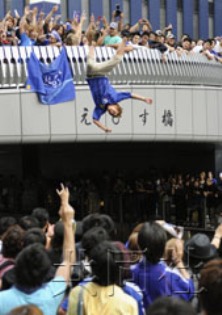 報道稱,大批身著日本隊藍色隊服的球迷涌上街頭占據(jù)了十字路口,甚至還有球迷跳入河中用這種奇特的方式慶祝勝利。比賽結(jié)束約20分鐘后,第一名球迷跳入河中,隨后又有50余人高呼萬歲跳進河里,連早有防備的在場警察也無法勸阻。