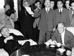 1946年,鳩山一郎在政權(quán)唾手可得之際,被盟軍總司令部以戰(zhàn)爭期間曾與軍部合作為由開除公職,吉田茂取而代之做了首相。恢復(fù)公職后,鳩山成為逼迫吉田內(nèi)閣交權(quán)的競爭對手。為和致力于日美外交的吉田相抗衡,1954年鳩山就任首相后以自身政治生命為賭注,于1956年實現(xiàn)了日蘇邦交正;耸麓藦V為人知。