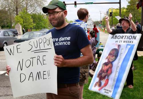 據(jù)報道,奧巴馬支持墮胎和胚胎干細胞研究立場,觸發(fā)天主教保守派人士和師生不滿。一些活動人士早已誓言干擾奧巴馬在該地的演講。