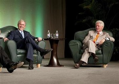 克林頓卸任后,多次與布什的父親、即前總統(tǒng)老布什合作,例如替南亞海嘯及超級颶風(fēng)“卡特里娜”天災(zāi)的災(zāi)民籌款,兩人有一段時間經(jīng)常走在一起。布什開玩笑道,不知道自己的父親花了多少時間與克林頓同場亮相。