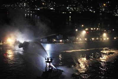 綜合此間報道,事發(fā)現(xiàn)場位于連接福岡縣北九州市與山口縣下關(guān)市兩市的關(guān)門橋正西約一公里的海面。兩船相撞后,KURAMA號的船頭和“CARINA STAR”號的集裝箱同時起火,火勢在半個多小時后得到控制,至少有三名自衛(wèi)隊成員在救火過程中受傷。