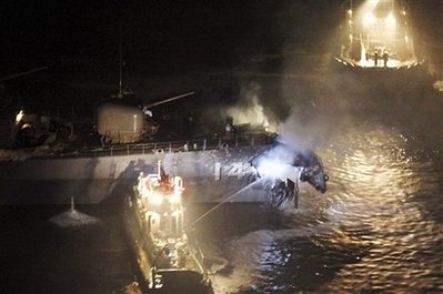 一九八一年開始服役的KURAMA號,隸屬日本海上自衛(wèi)隊第二艦群,全長一百五十九米,寬十七點五米,排水量五千二百噸,最大時速三十一海里,搭乘三架反潛直升機。在剛剛于十月二十五日結(jié)束的日本海上自衛(wèi)隊觀艦式(相當(dāng)于海軍閱兵式)上,該船作為“觀閱艦”為日本副首相菅直人的搭乘艦。事發(fā)時,KURAMA號正處于結(jié)束觀艦式后返回佐世;氐耐局。艦上載有一百五、六十名自衛(wèi)隊隊員。而與其相撞的韓國集裝箱船“CARINA STAR”號全長一百二十七米,寬二十米,事發(fā)時正處于自韓國釜山前往日本大阪的途中。