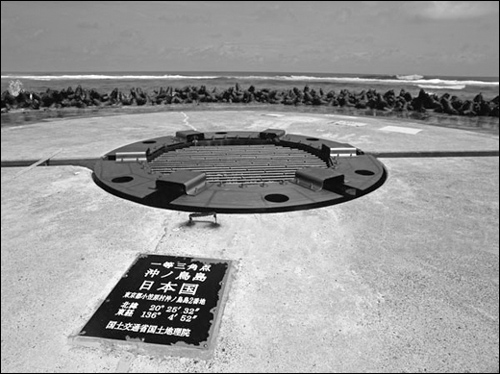 沖鳥礁位于東京都南方約1740公里處,南北長1.7公里,東西寬4.5公里,一直無人居住。其地質構造屬于珊瑚礁,本來由6塊巖礁組成,但由于長年被海浪侵蝕,正在不斷沒入海面或消失,現(xiàn)在只有兩塊巖礁露出水面。