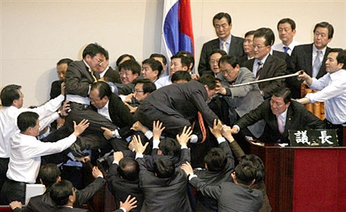 韓國(guó)國(guó)會(huì)議員2007年12月14日因一項(xiàng)彈劾檢察官的提案而發(fā)生大規(guī)模群毆,這些檢察官為呼聲最高的總統(tǒng)候選人李明博清除了詐欺罪嫌。據(jù)“中央社”報(bào)道,在大約100名在野黨籍議員以桌椅阻擋國(guó)會(huì)主要議事廳的出入口后,一群親政府的議員被迫穿越圍欄以設(shè)法進(jìn)入議事廳。 chinanews發(fā) 攝