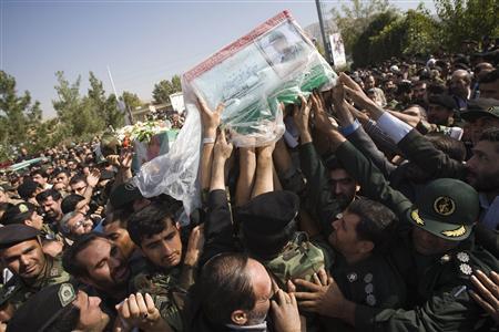 幾千名伊朗人,大部分為軍人,參加了在德黑蘭革命衛(wèi)隊基地舉行的葬禮,人群高舉遇難將領與最高精神領袖哈梅內伊的巨幅照片。