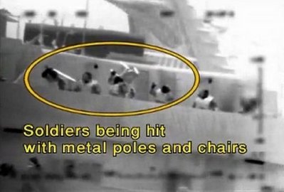 以軍發(fā)布長(zhǎng)1分鐘的紅外線錄影片段,并配上英文字幕上載至YouTube網(wǎng)站。片段可見,當(dāng)首名士兵從直升機(jī)游繩而下,甫踏足土耳其救援船“馬維.馬爾馬拉號(hào)”甲板之際,一名船員便向他投擲閃光彈,甲板上的人紛找掩護(hù)或伏在地上。這時(shí)候,有船員抓住以軍的繩子搖晃,一名士兵似脫手掉下。他們又把繩子縛在甲板,企圖扯下直升機(jī)。降落甲板計(jì)程車兵遭佩戴防毒面具的船員攻擊。字幕稱:“士兵遭人以金屬棒和椅子毆打!贝瑔T又企圖搶奪士兵的武器,一名士兵更被多名船員合力抓住雙腿,從甲板拋下!