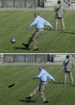 只見奧爾默特抬腿一腳,自己的鞋與球一起飛了出去。有目擊者說,奧爾默特本人也“啞然失笑”。他目前丑聞纏身,警方當天宣布要和他進行新一輪問訊,不知此事是否影響了他的心情。