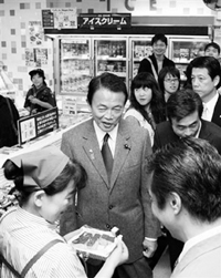 一方面對(duì)在野黨表現(xiàn)出強(qiáng)硬的一面,另一方面,麻生對(duì)普通百姓的生活則表現(xiàn)出首相的體恤民情。近期日本物價(jià)上漲十分明顯,10月19日,麻生親自到超市了解物價(jià)等民情,并在路上詢(xún)問(wèn)出租車(chē)司機(jī)的收入。不過(guò),在做完這些后,麻生并沒(méi)有太多顧忌自己現(xiàn)在的身份,照常徑直去了酒店參加飯局。對(duì)此,麻生向媒體解釋說(shuō),這是他一直以來(lái)的生活習(xí)慣,從沒(méi)考慮過(guò)改變,而且與人數(shù)眾多的人會(huì)面,酒店內(nèi)的酒吧既安全又便宜。