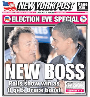 據(jù)美國《紐約郵報》3日報道,美國當?shù)貢r間11月2日,奧巴馬一家在俄亥俄州克利夫蘭的競選集會上與著名美國搖滾歌手布魯斯斯普林斯廷同臺獻藝。新一輪民調(diào)顯示,離大選還有最后一天,奧巴馬已經(jīng)贏了。該報封面用“新老板”來稱呼勝利在望的奧巴馬。該報稱:斯普林斯廷用歌聲表達了對奧巴馬的贊揚。據(jù)悉,1984年大選中,獲勝的里根曾引用斯普林斯廷的歌詞以爭取年輕人的選票。