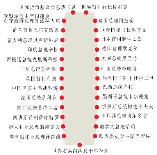 為體現(xiàn)此次峰會(huì)的代表性,一些國際和區(qū)域組織的領(lǐng)導(dǎo)人也應(yīng)邀出席了此次峰會(huì),諸如世界銀行行長佐利克、世貿(mào)組織總干事拉米和國際貨幣基金組織總裁卡恩等。據(jù)悉,佐利克、卡恩及拉米三人分坐在宴會(huì)桌的兩頭。
