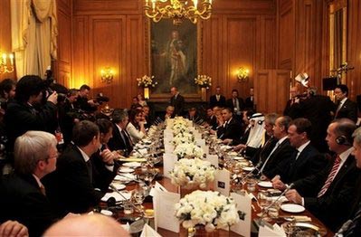 據(jù)《衛(wèi)報(bào)》4月2日披露,作為東道主,英國首相布朗坐在了橢圓形宴會(huì)桌主人應(yīng)該坐的位置上,中華人民共和國主席胡錦濤坐在他右側(cè),印尼總統(tǒng)蘇西洛坐在布朗的左側(cè),約旦國王阿卜杜拉二世坐在布朗的正對面。據(jù)悉,布朗將私下會(huì)晤阿卜杜拉,兩人將就兩國之間的軍火交易進(jìn)行商談。法國總統(tǒng)薩科齊被安排坐在胡錦濤的右側(cè)。俄羅斯總統(tǒng)梅德韋杰夫被安排坐在墨西哥總統(tǒng)卡爾德龍和土耳其總理埃爾多安之間。