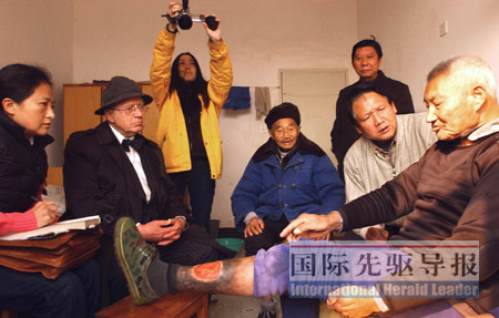 78歲的盛益銀小心翼翼地挽起褲腳,露出結(jié)了痂的右腿。坐在一旁的邁克爾•弗蘭茨布勞俯下身摸了摸,然后從發(fā)病的時(shí)間、癥狀到如何得到救治一一詢問(wèn)起來(lái)。