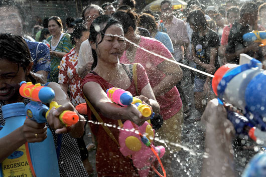 在幾天前紛紛暫停營(yíng)業(yè)的曼谷暹羅廣場(chǎng)商業(yè)區(qū),唐人街的金店重新開(kāi)門(mén)迎客。游客們又有了花錢(qián)的去處。15日晚上,在熱鬧的是隆路和考訕路,外國(guó)游客和泰國(guó)人無(wú)憂無(wú)慮地互相潑水、打水槍。