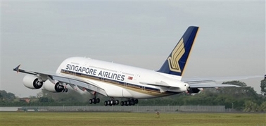 中新網(wǎng)10月25日電 新加坡航空公司首班空客A380客機(jī)25日上午載著455名乘客,從樟宜機(jī)場(chǎng)起飛前往澳大利亞悉尼。這是這款全球最大的客機(jī)的首次商業(yè)飛行。此次旅行大約需要7小時(shí)。
