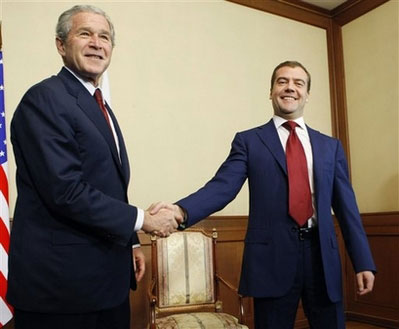 據(jù)香港《文匯報(bào)》報(bào)道,布什贊揚(yáng)普京誠實(shí)坦白,會說出心中所想。普京下月就會卸任總統(tǒng),由梅德韋杰夫接任。布什與梅氏首次會面后,贊賞對方為人直接,指出梅氏給他的印象非常正面,是個(gè)聰明人,很期待與他合作。梅氏表示會跟隨普京的足跡,尋求與美國發(fā)展更深厚的關(guān)系。峰會結(jié)束,布什昨午已啟程返美。