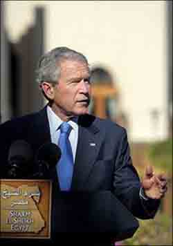 做客以色列和巴勒斯坦,是布什此訪的重中之重。在會(huì)晤以巴領(lǐng)導(dǎo)人后,布什就巴難民回歸、巴以最終邊界劃分和耶路撒冷地位等以巴沖突核心問題闡述了自己的主張。布什稱,難民問題可以通過建立巴勒斯坦國得到解決,同時(shí)輔以相關(guān)賠償機(jī)制。布什呼吁以色列結(jié)束1967年以來對(duì)阿拉伯土地的占領(lǐng),確保巴成為獨(dú)立自主國家。可他又說,以巴未來邊界將不可能完全依據(jù)第三次中東戰(zhàn)爭之前的;鹁,雙方應(yīng)根據(jù)目前實(shí)際情況進(jìn)行調(diào)整并達(dá)成協(xié)議。關(guān)于耶城歸屬問題,布什認(rèn)為這是一個(gè)棘手難題,牽涉政治和宗教。他再次要求以巴為在今年內(nèi)達(dá)成和平協(xié)議作出“痛苦讓步”。