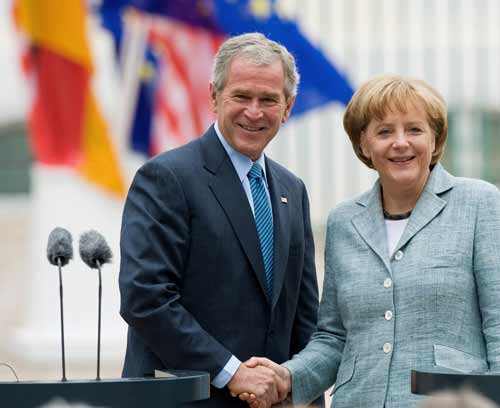布什訪問德國,與德國總理默克爾女士共同舉行了記者招待會。