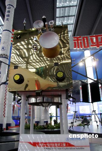 10月11日,“嫦娥一號”衛(wèi)星模型在深圳高交會上亮相,因其是中國首顆人造月球衛(wèi)星并即將發(fā)射而備受關(guān)注。國防科學(xué)技術(shù)工業(yè)委員會副秘書長胡亞楓當(dāng)天表示,中國探月一期工程已基本完成各項研制任務(wù),“嫦娥一號”衛(wèi)星發(fā)射已進入倒計時,即將實現(xiàn)中國人幾千年奔月的夢想。中新社發(fā) 孫自法 攝
