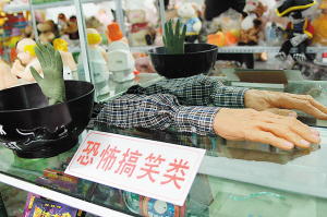 走進這家名為“搞笑玩具店”的大門,不小心觸到了懸掛在半空中的一件玩具,一陣“鬼叫聲”嚇了記者一跳,順著聲音望去,只見懸掛在半空中的是一個“玩具骷髏”,正順著繩索一邊怪叫著,一邊往上爬。這次驚嚇還沒緩過來,那邊一條斷臂又著實嚇人不輕,撕裂的衣服袖子里,一條慘白的手臂“躺”在柜臺里,好在旁邊的文字還能安慰一下受驚的心——恐怖搞笑類。原來,這邊柜臺里的玩具都帶著“恐怖”色彩。在旁邊的另一個柜臺上,分別設(shè)計成男女人體形狀的兩個玩具筆架引起了記者注意。只見這兩個筆架的筆插孔處分別設(shè)計在男子和女子的下身隱私處。