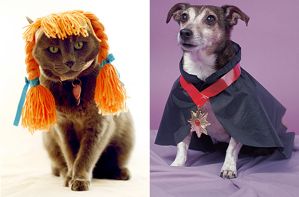 圖片二:左邊一副圖片中,一只可愛的小貓頭頂一副麻花辮假發(fā),也許它想用它來嚇唬其他動物,可它沒想到這樣讓它看起來更可愛;在右邊一幅圖片中,一只小狗打扮成吸血鬼的模樣,威風(fēng)凜凜的可愛模樣足以嚇走別人么?(鐘巖)