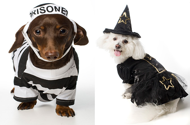 圖片八:左邊圖片中,小狗盧克正為大家進(jìn)行囚犯服裝的模特表演展示,而在右邊,瘋狂的杰克正裝扮成一個女巫,慶祝即將到來的萬圣節(jié)之夜。(鐘巖)