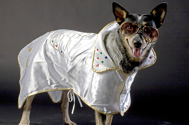 圖片九:身著華麗的白色演出服,戴著酷酷的遮住半個(gè)臉的大墨鏡,你想起誰(shuí)了?“貓王”?沒(méi)錯(cuò),圖片中,這只獵犬便被他的主人打扮成了這幅模樣,它的主人一定是貓王的追隨者。(鐘巖)
