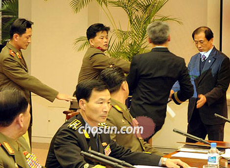 據(jù)報道,在此過程中,韓國會務(wù)人員海軍少校金某走向放置投影儀地方去要切斷電源,朝鮮一隨行人員推了兩次金某,表示強烈抗議。