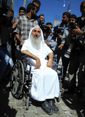 2005年6月,我見到亞辛,白衣老人坐在輪椅上,看起來十分瘦小,兩只手無力地垂在胸前。銀白的胡須、凌厲的鷹鉤鼻。他的聲帶顯然受損,聲音好像一把刀片刮在玻璃上,尖利卻不清楚。如果你距離他超過一米就根本聽不見他在說什么。藍灰色的眼珠看起來有些渾濁。有時他仰頭向上看,嘴唇微微張開,眼神呆滯;有時他的眼珠又異常靈活,發(fā)出冷冷的光。兩種表情在他臉上交替出現(xiàn)。8年的牢獄生活使亞辛的身體狀況進一步惡化,視力、聽覺嚴重受損,完全癱瘓。