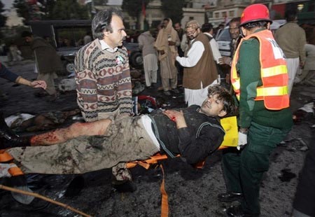 圖文:巴基斯坦爆炸現(xiàn)場(chǎng)救援人員搶救傷者